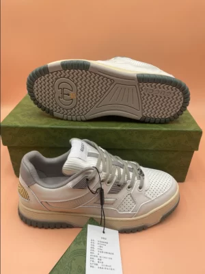 The Women’s Distressed Effect Sneaker by Gucci, a captivating blend of edgy charm and contemporary allure. Crafted from luxurious off-white leather with white perforated fabric inserts and grey rubber details, these sneakers exude a chic, worn-in aesthetic. The iconic Gucci script adds a touch of sophistication, while the interlocking G detail on the laces showcases the brand’s signature style. Complete with a durable rubber sole, lace-up closure, and low heel for comfort, these sneakers come with an additional pair of laces for versatile styling options.
